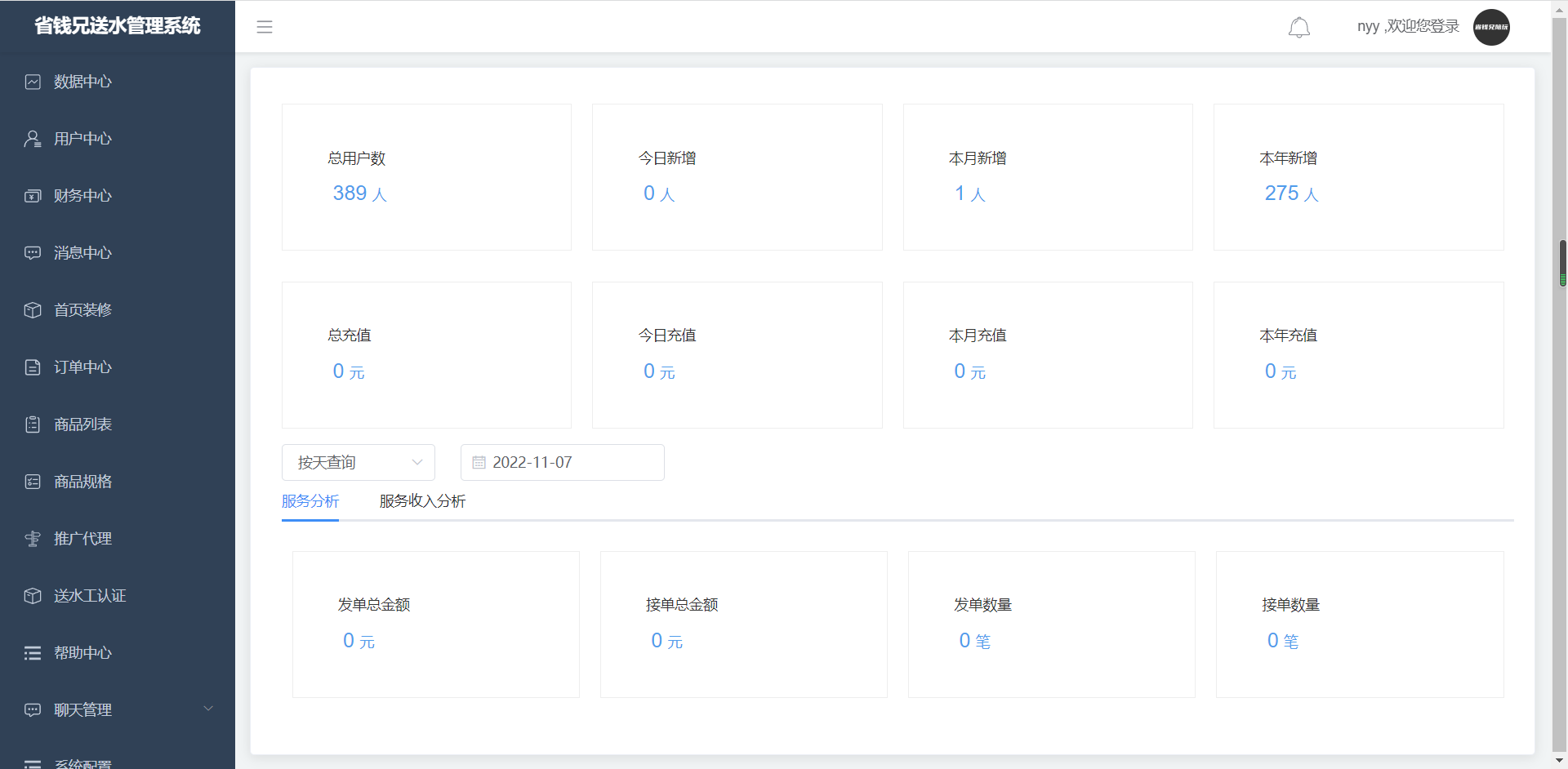 1. 进入数据中心页面,可查看用户数和充值量,点击‘按天筛选’输入框,有‘按天筛选’、‘按月筛选’、‘按年筛选’的选择列表。选择时间框,可选择日期。选择后可查看服务分析、服务收入分析的分析数据。