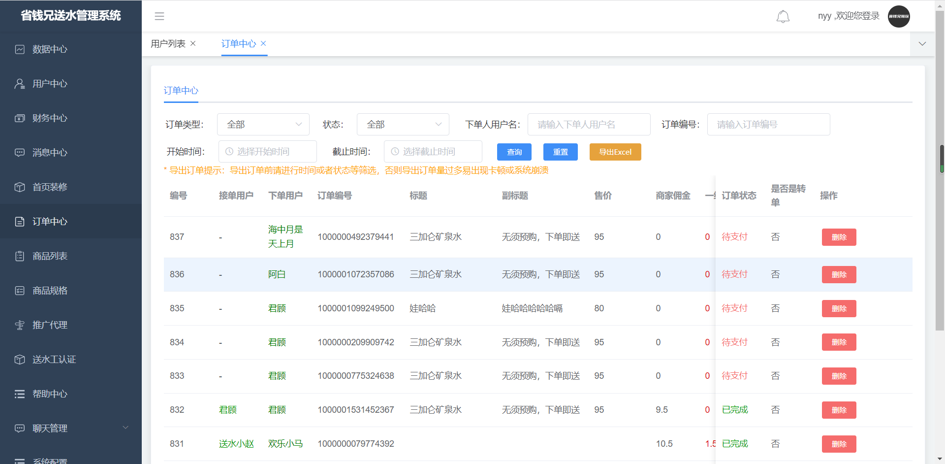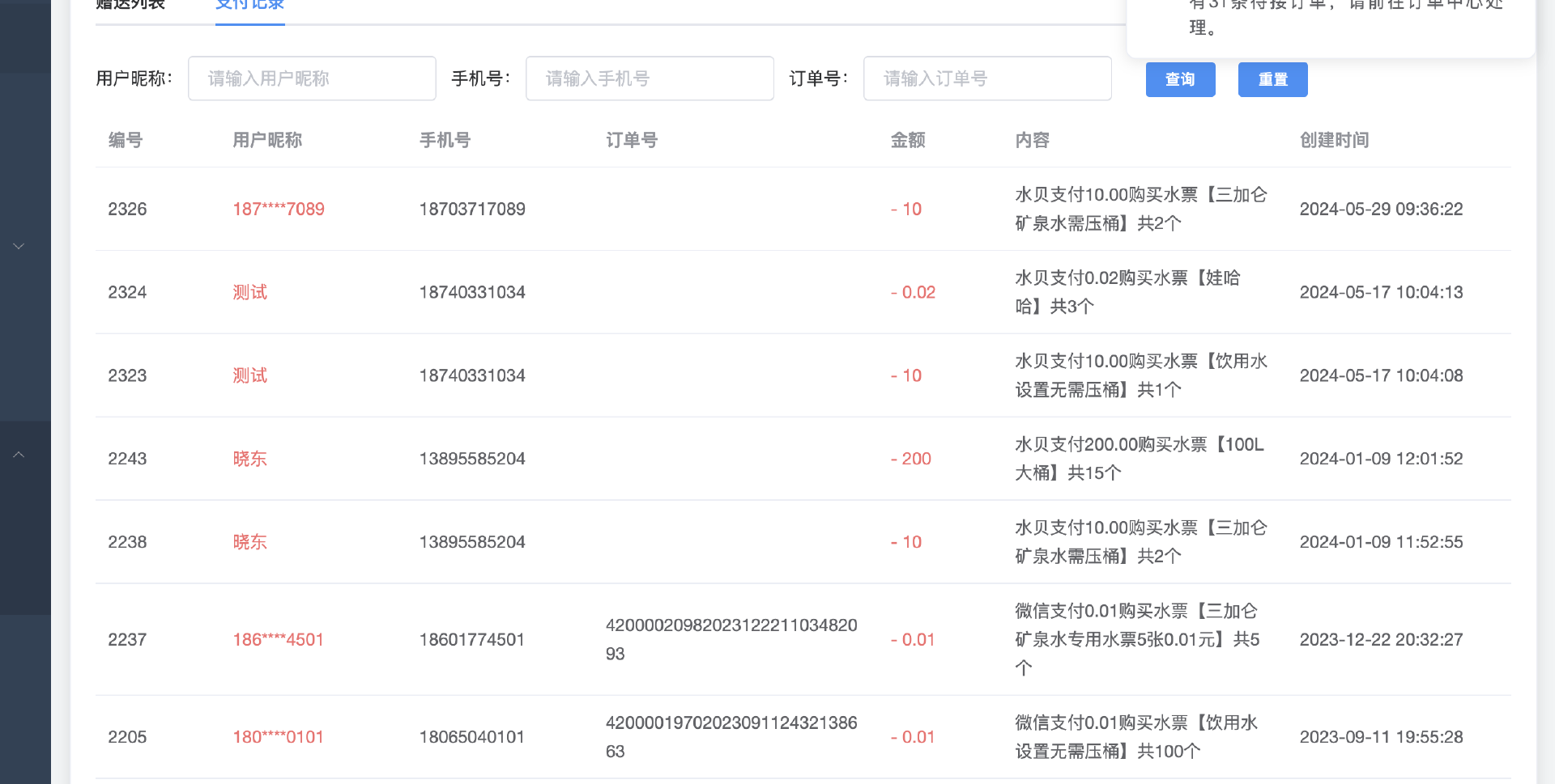 1. 查询订单,可根据状态、订单号、类型、收货人手机号、下单用户名进行筛选查询;可进行删除操作。