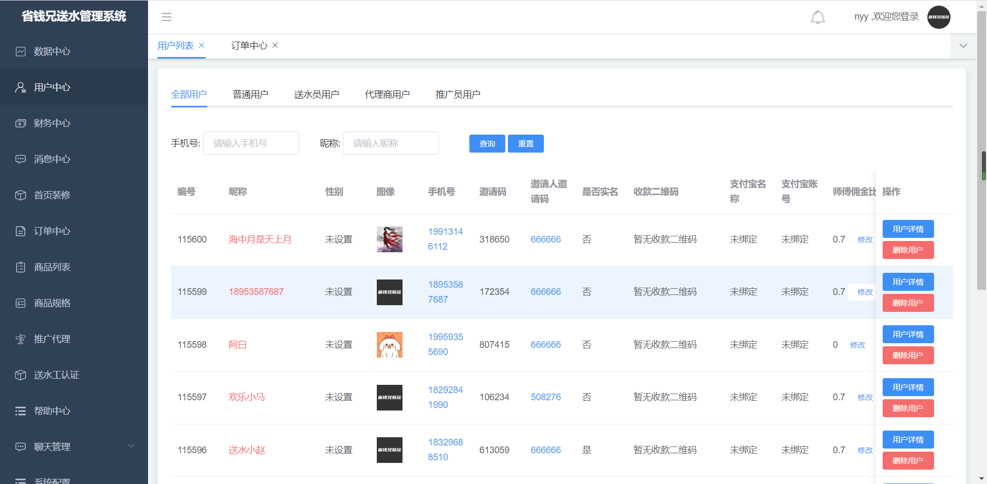 1. 用户列表,可通过手机号、微信昵称筛选用户,用户分为普通用户和商家用户;状态栏里,可修用户状态;点击用户详情可进入用户详情页面查看用户信息;点击删除用户按钮可删除用户
