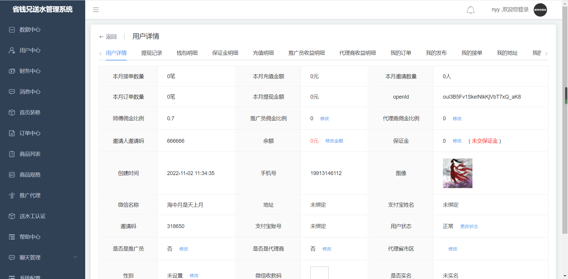· 用户详情查看用户的基本信息,余额、用户状态、年龄、性别可修改操作;