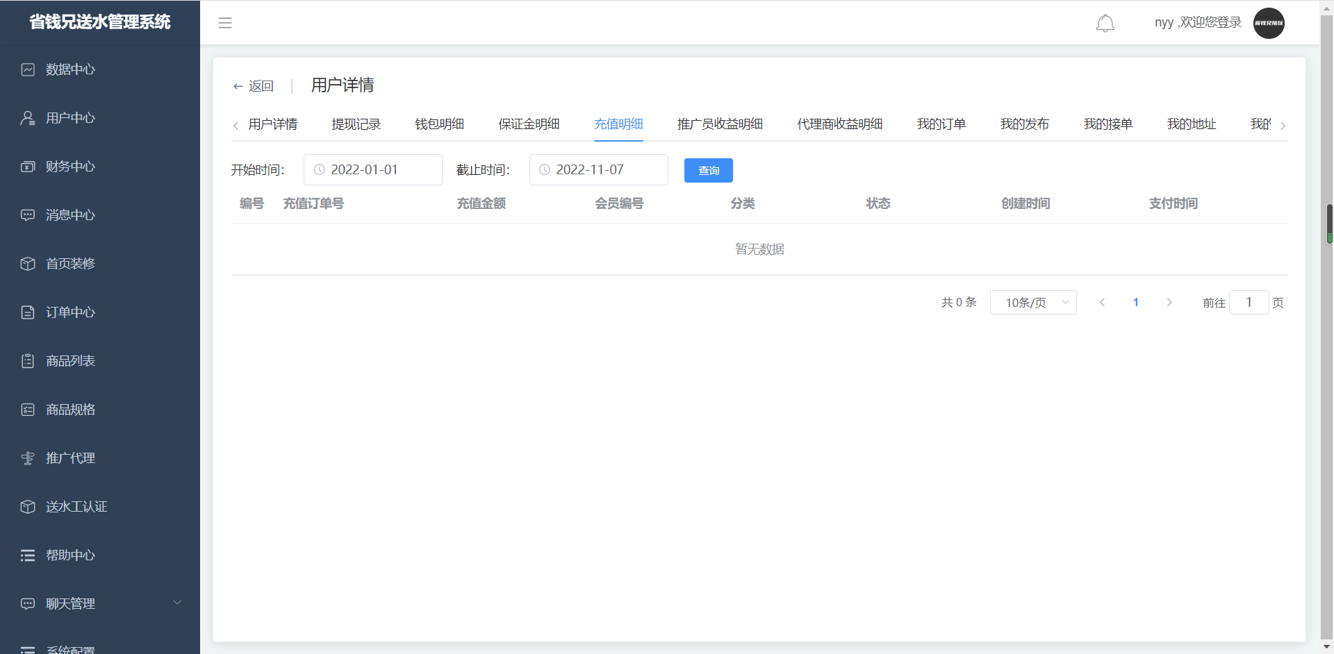 · 点击用户详情,进入充值明细页面,查看我的充值明细。