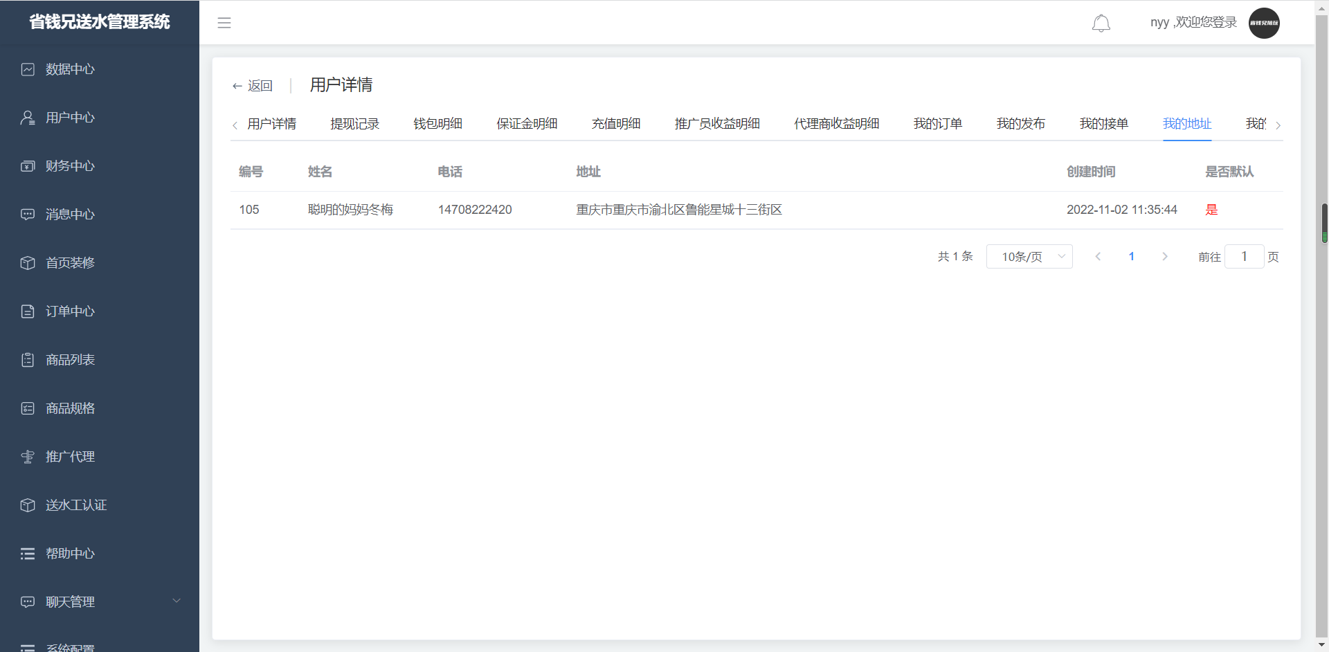 · 点击用户详情,进入我的地址页面,查看我的地址。