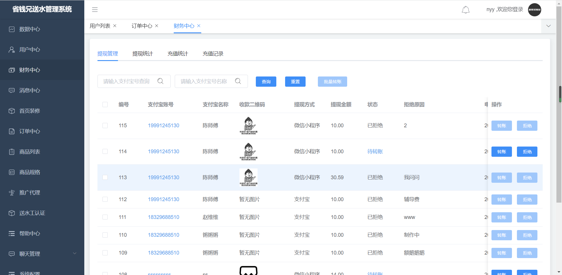 1. 提现管理,可通过支付宝账号和支付宝名称筛选查看,可进行通过和拒绝操作