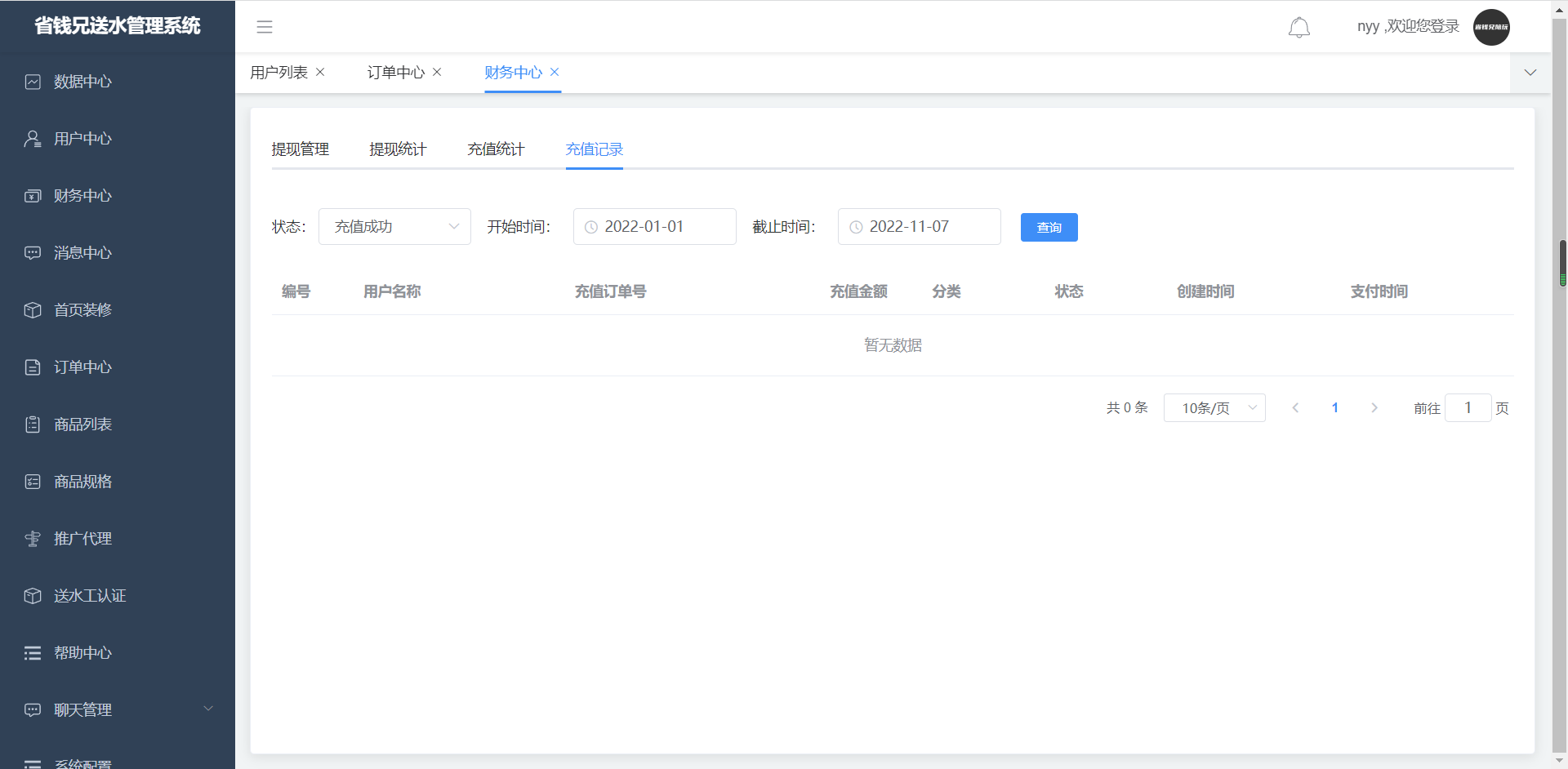 4. 充值记录,可根据状态、开始时间、结束时间进行筛选查看