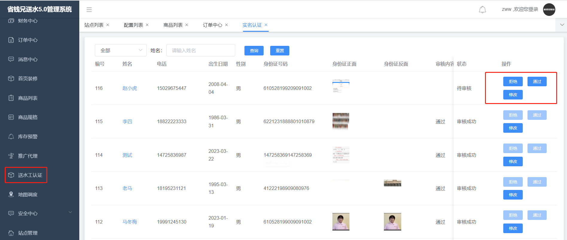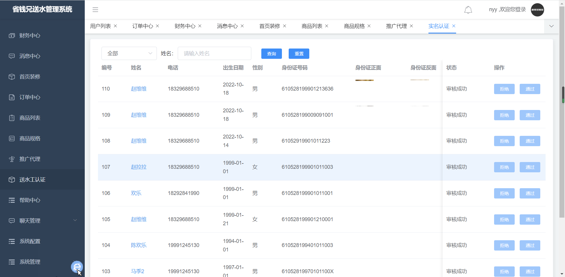 · 认证列表,可根据类型、状态、姓名进行筛选,可进行审核操作