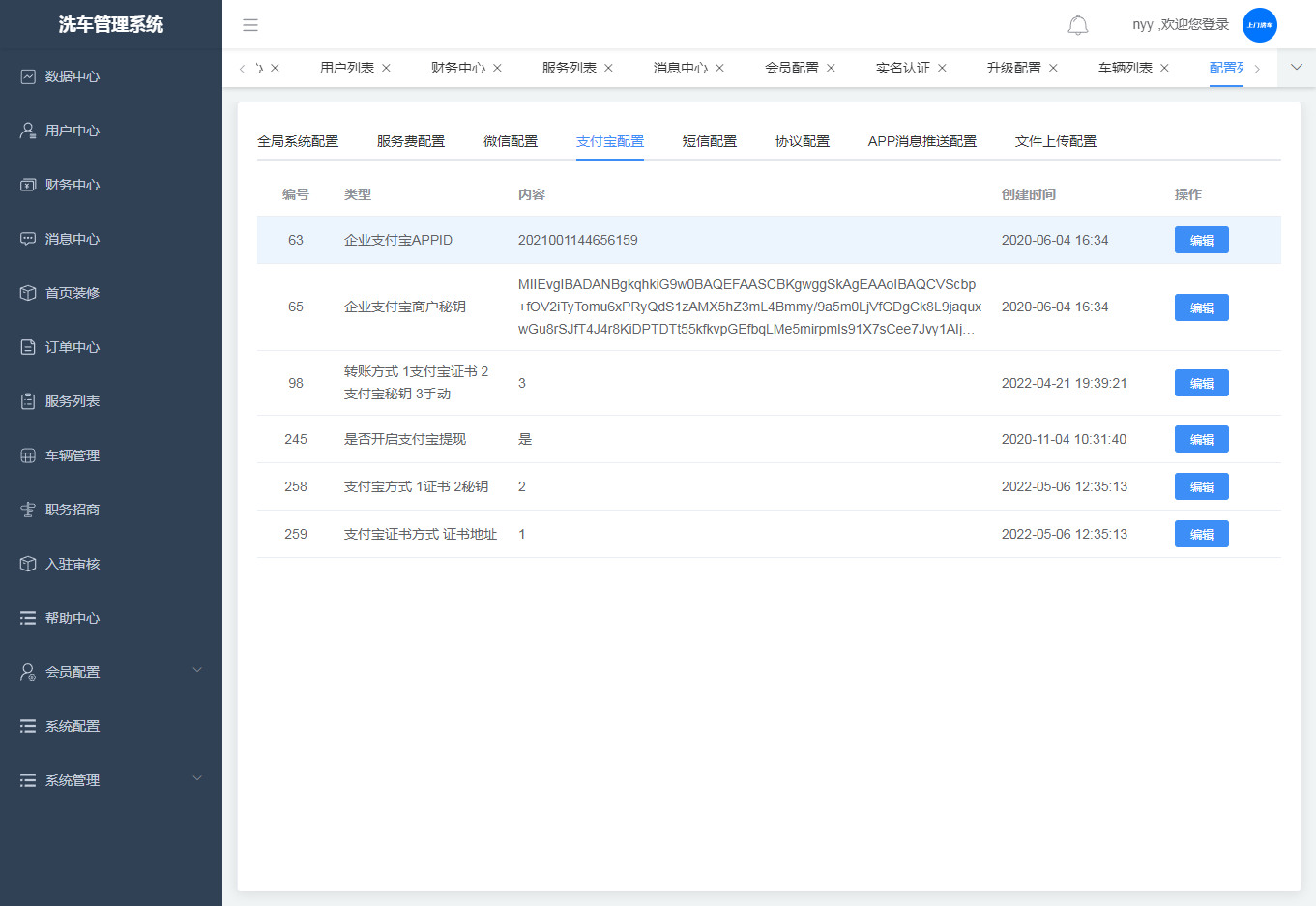 ·支付宝配置,可对配置进行编辑