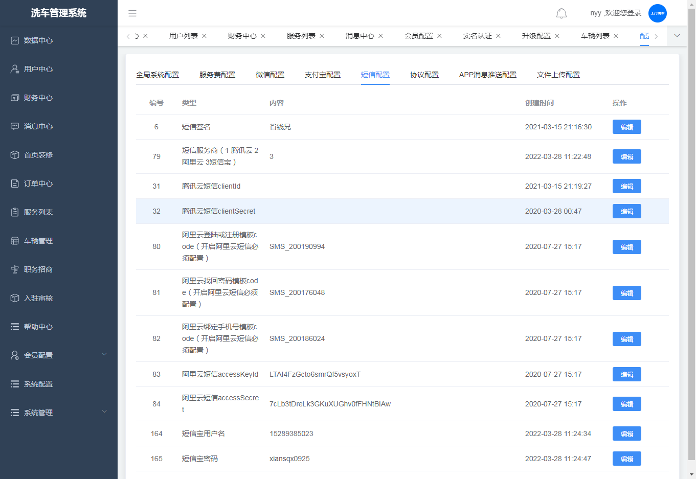 ·短信配置,可对配置进行编辑