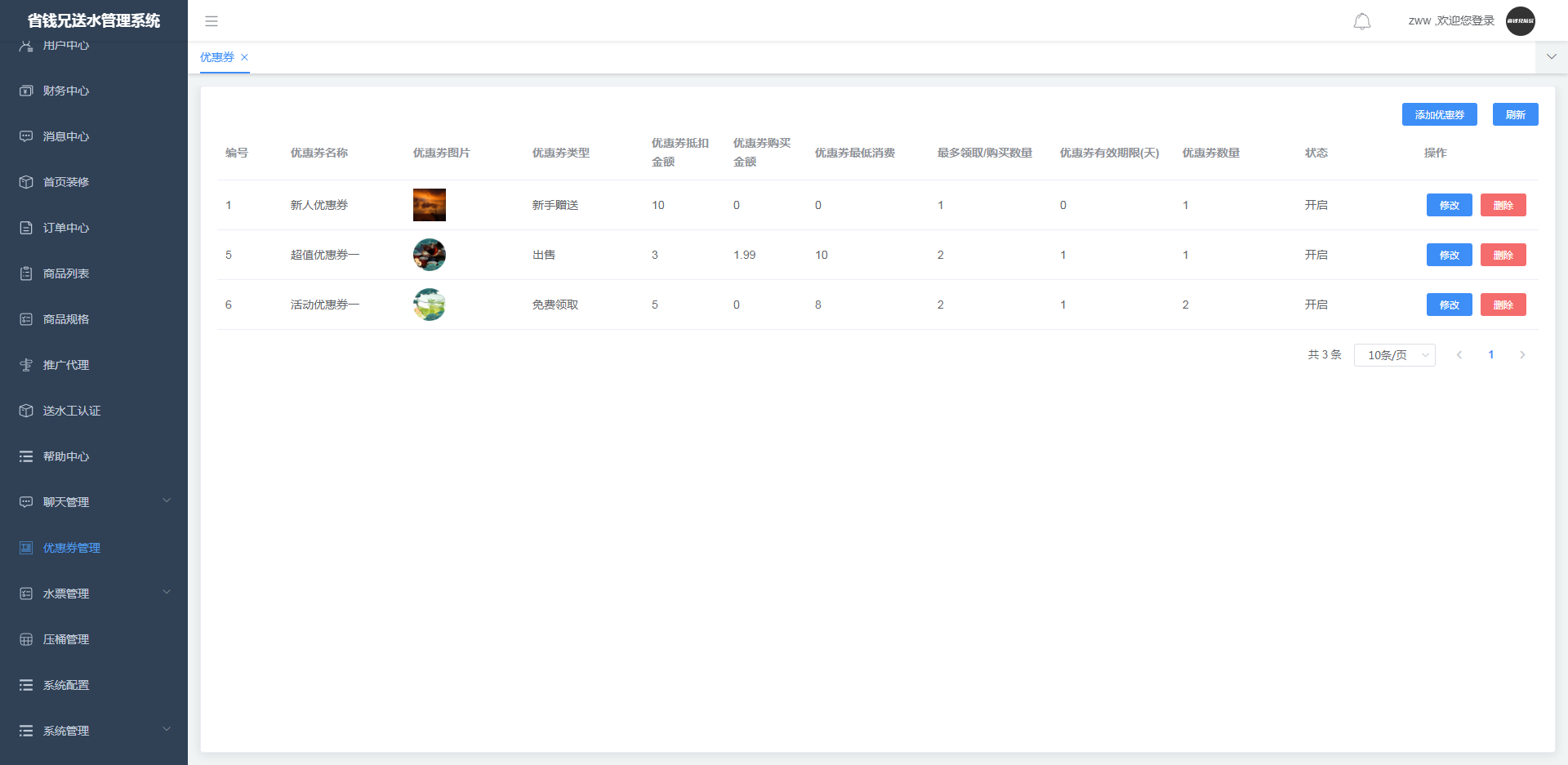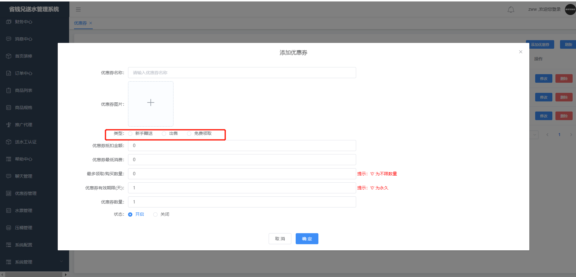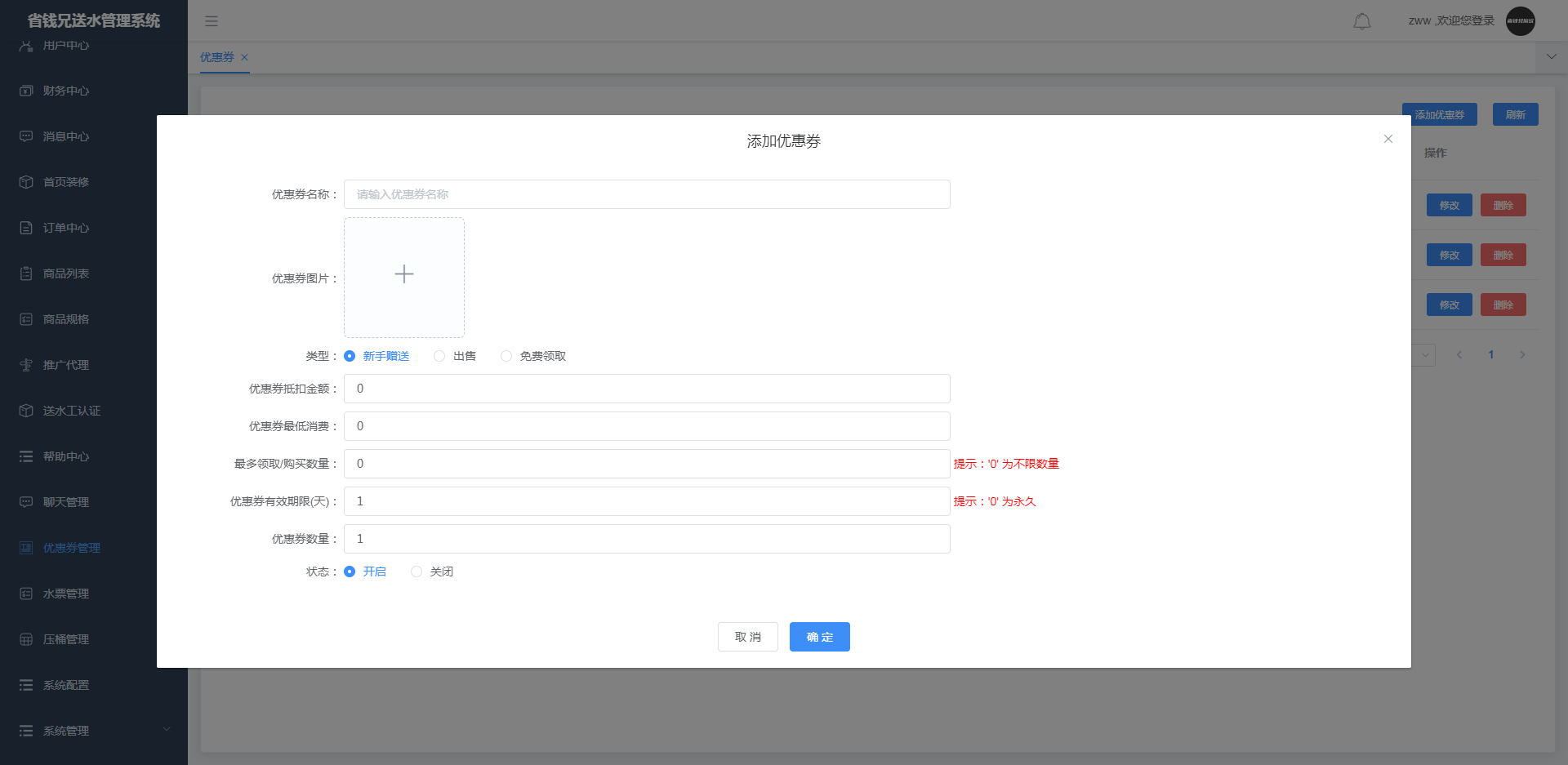 可直接添加、修改、删除优惠券