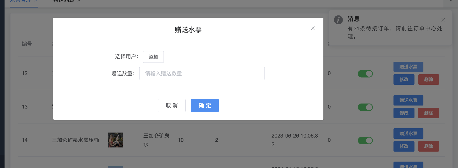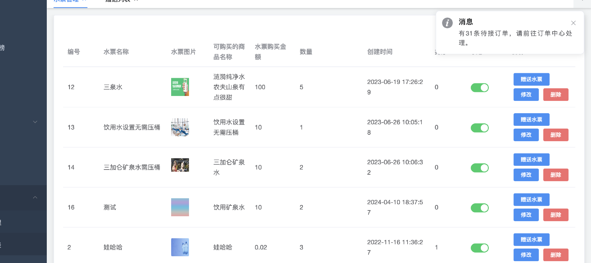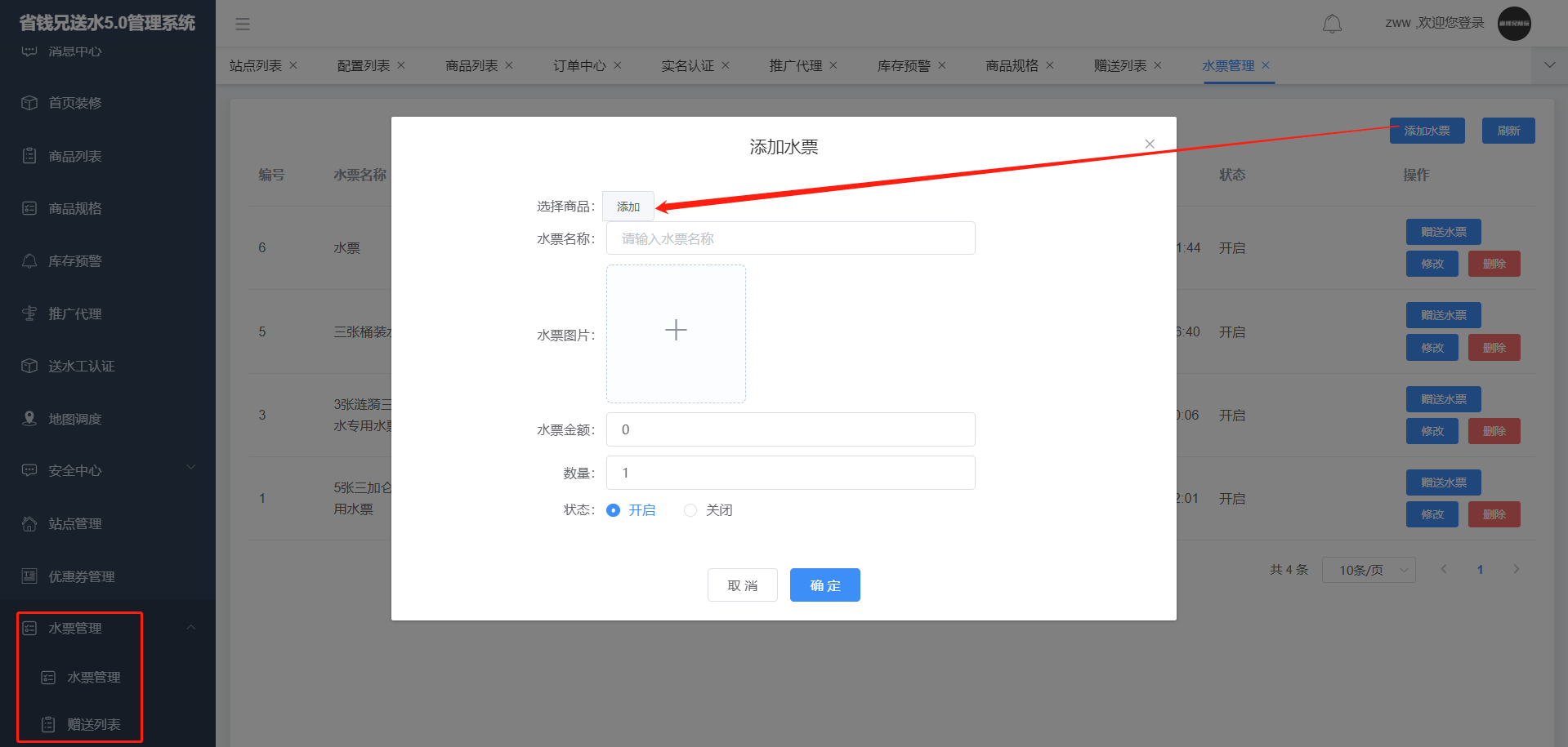 管理端选择商品,设置水票价格和水票数量等,水票关联商品,一个商品关联一个水票,如果被使用了 一定不能删除这个水票,删除就导致购买的人用不了,可以关闭不能删除