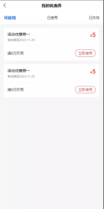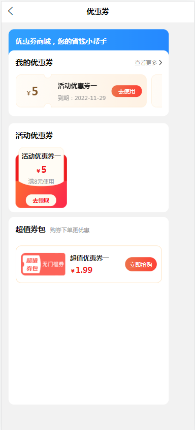 进入‘优惠券’页面后,可查看 我的优惠券、活动优惠券;点击活动优惠券的‘去领取’,可直接领取优惠券,点击‘查看更多’可进入我的优惠券页面: