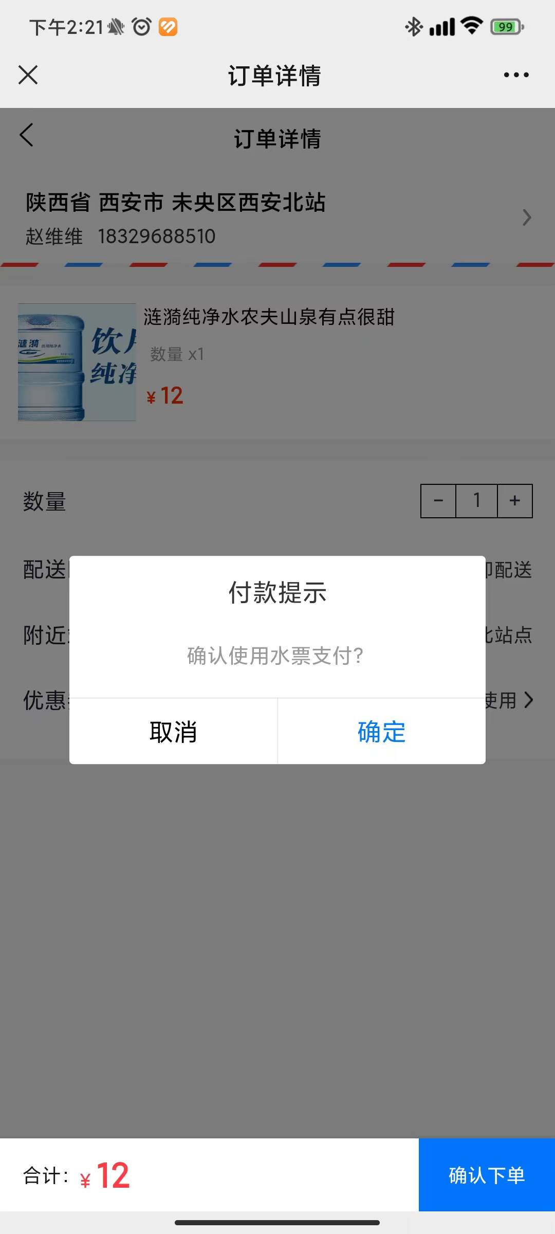 用户可选择购买水票,每次下单时,可选择水票支付,如取消订单,则水票会退回到账户