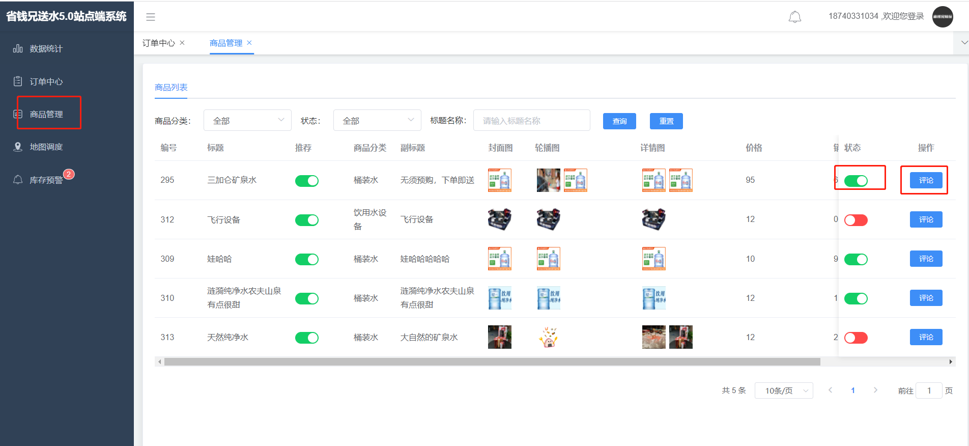 商品列表展示该站点的所有商品,可关闭该商品,也可查看该商品的评价