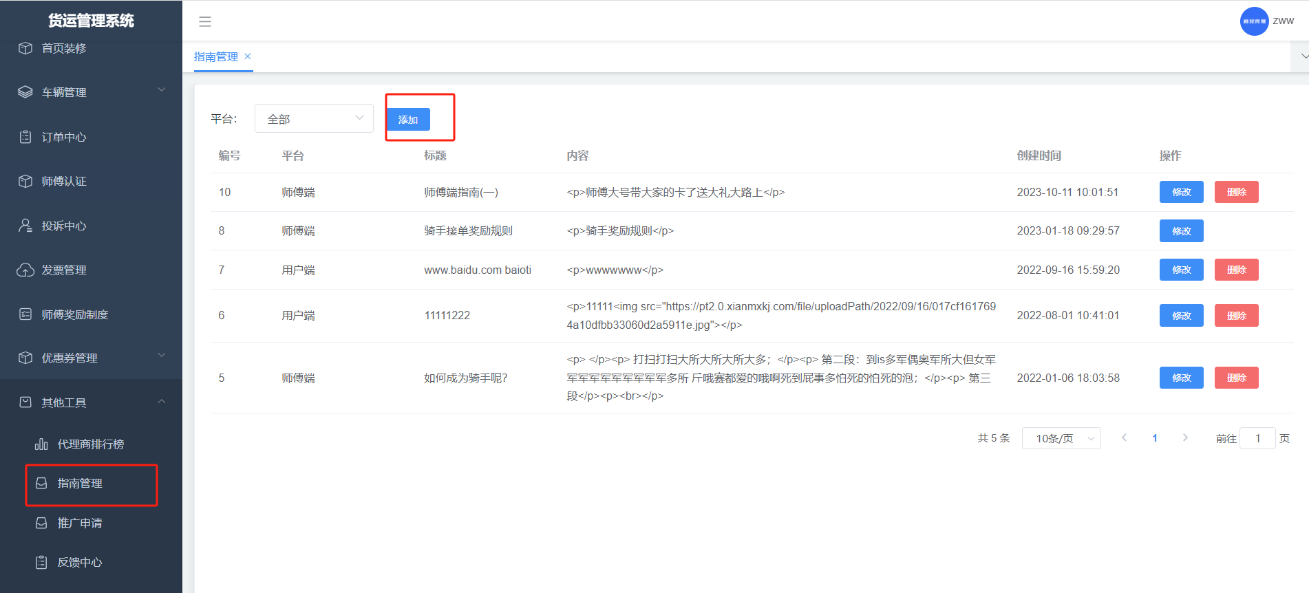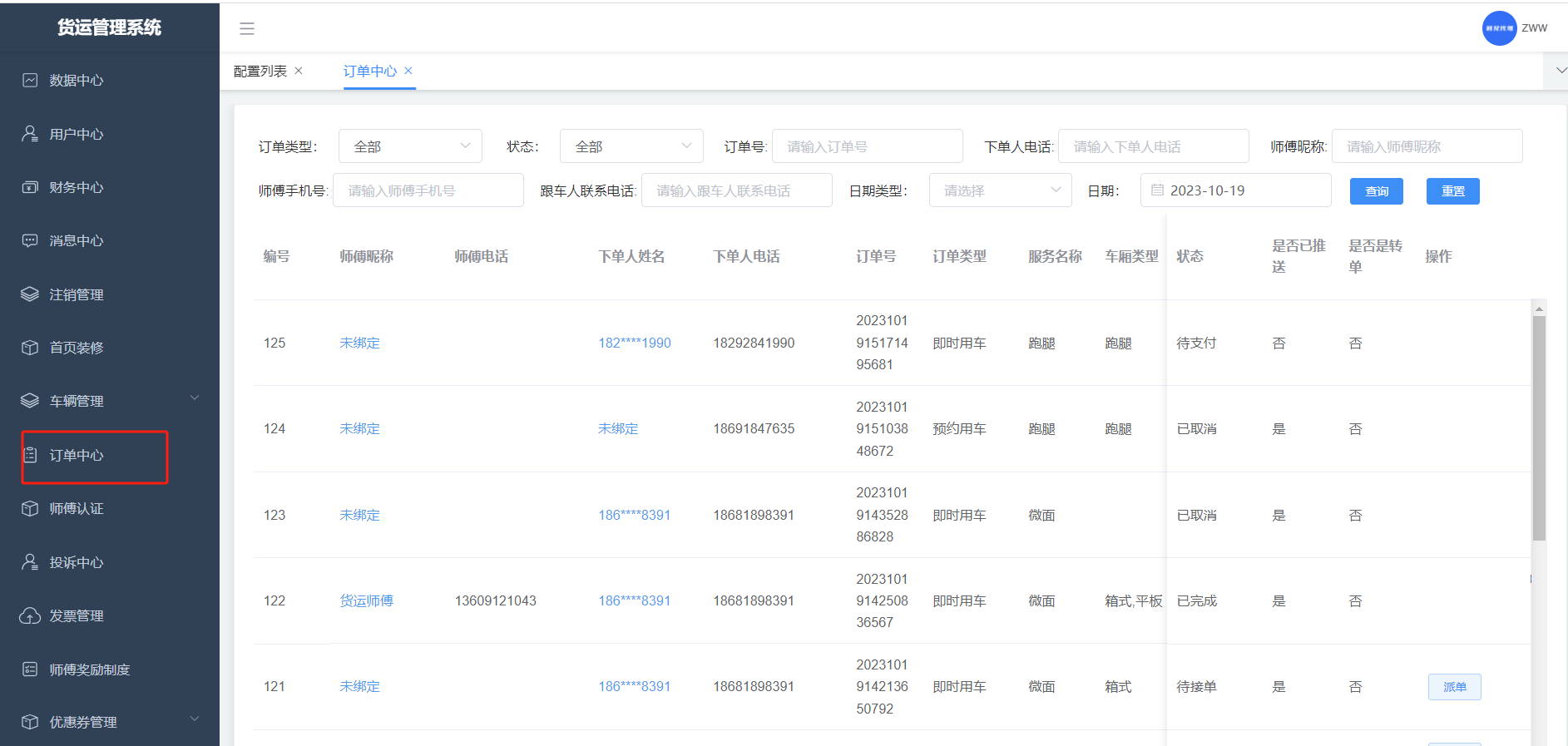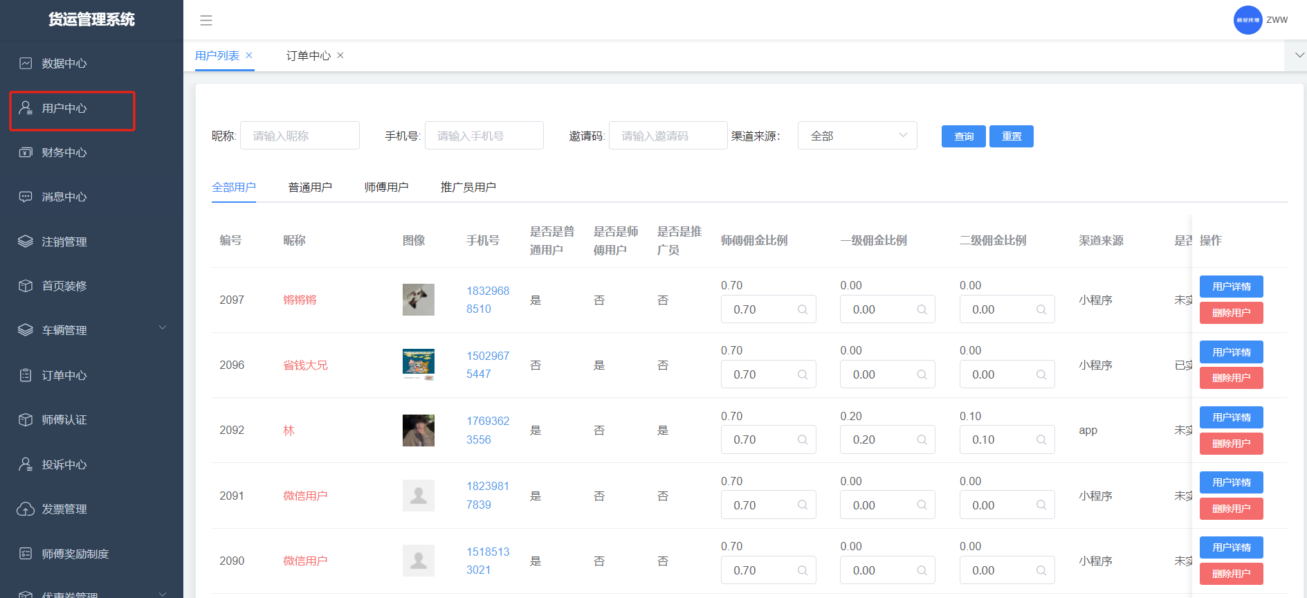 用户发起的所有订单都在该列表,也可对订单进行操作:指派等