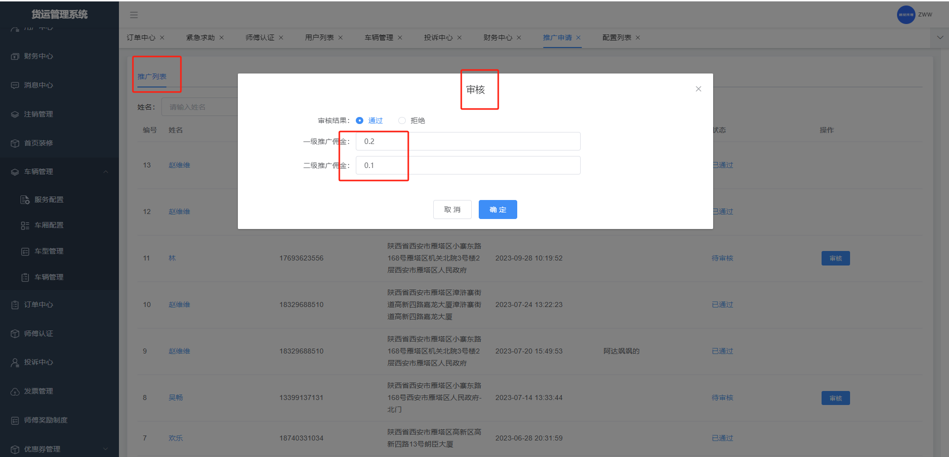 推广员用户的一二级分佣不为0,可给推广员设置一二级佣金