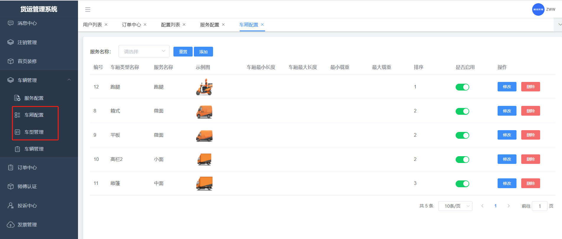添加:服务,给服务添加车型和车厢,以及收费金额