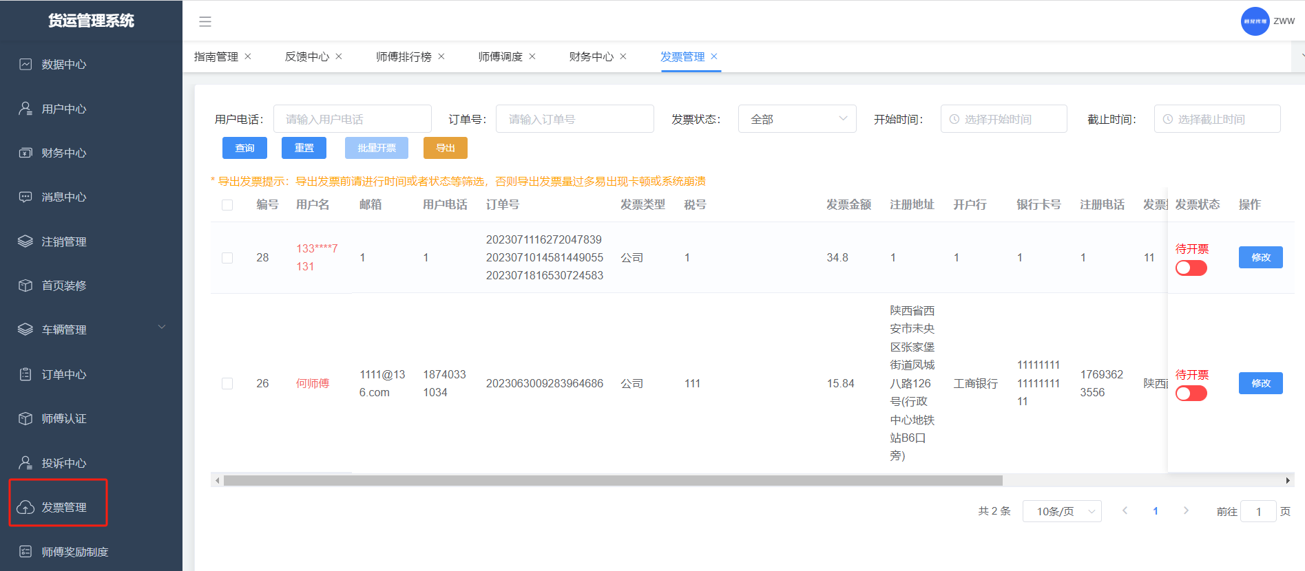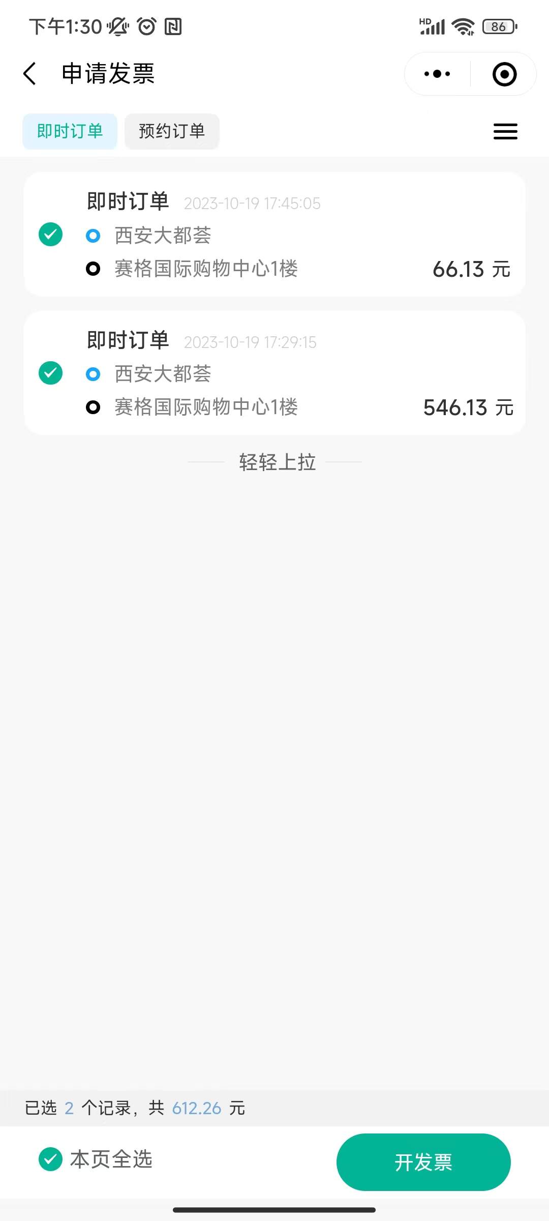 用户可对完成的订单发起开票申请,可一次性选择一个或者多个订单,线下开票成功后修改开票状态即可