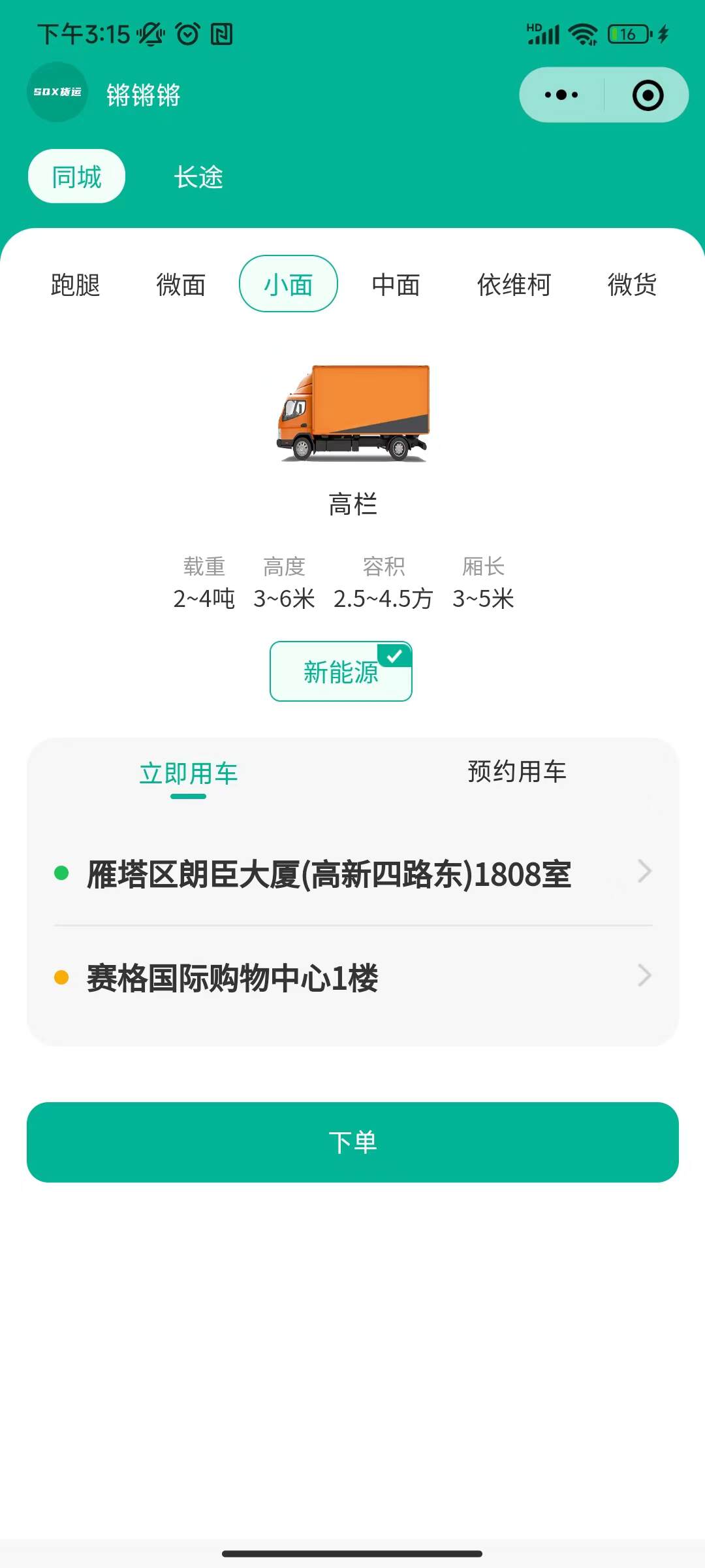 用户在首页进行下单,需要选择服务类型+车厢+车型类型,车型和车厢至少选择一个,有这个车辆的师傅就可以接单