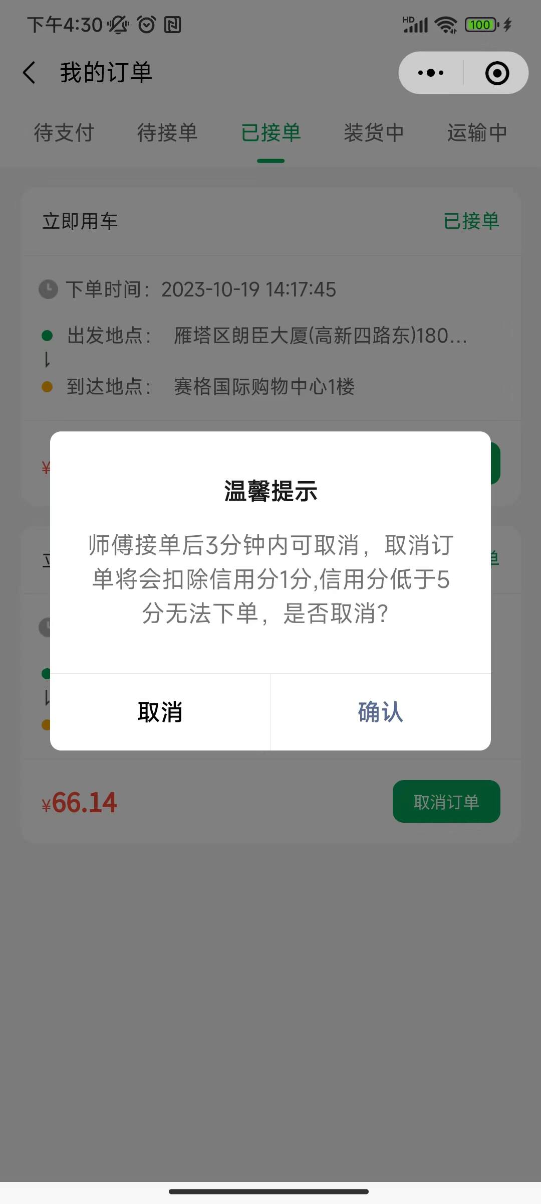 用户下单被师傅接单后,设置时间内可以取消,取消订单会扣除设置的信用分;