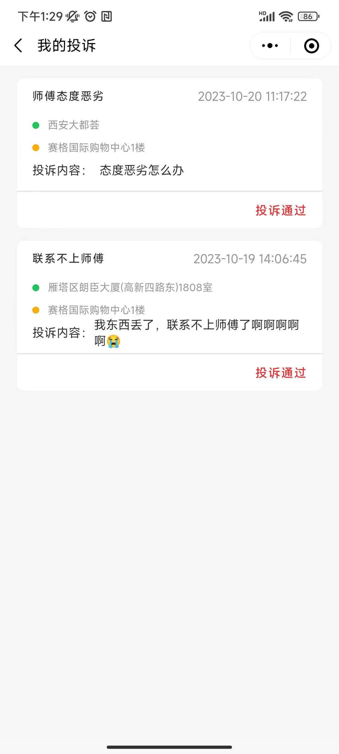 订单完成后,用户可对师傅进行投诉,在我的投诉页面可查看到用户所有的投诉记录,也可看到处理结果