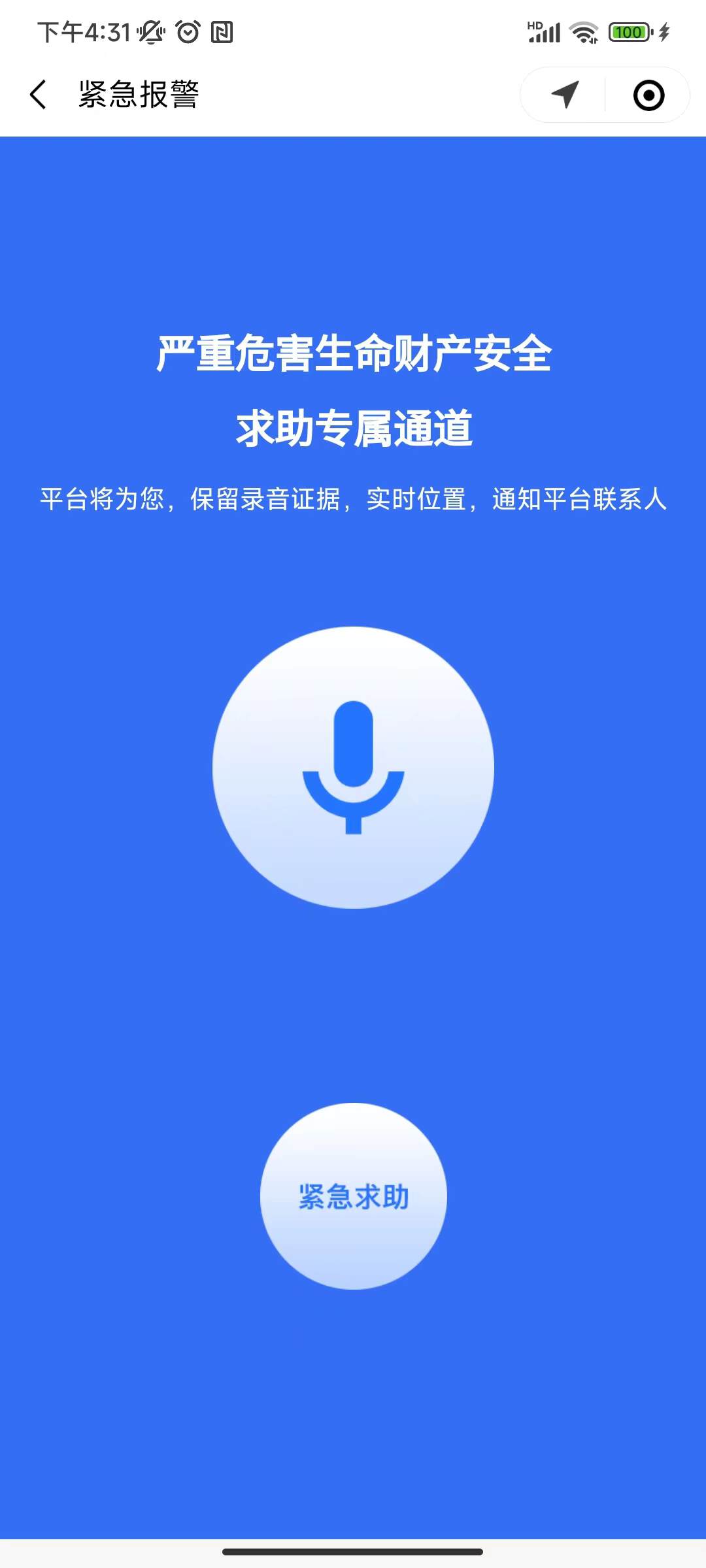 用户端小程序可以紧急报警,获取语音权限后,发送语音到后台,后台看到后会及时处理