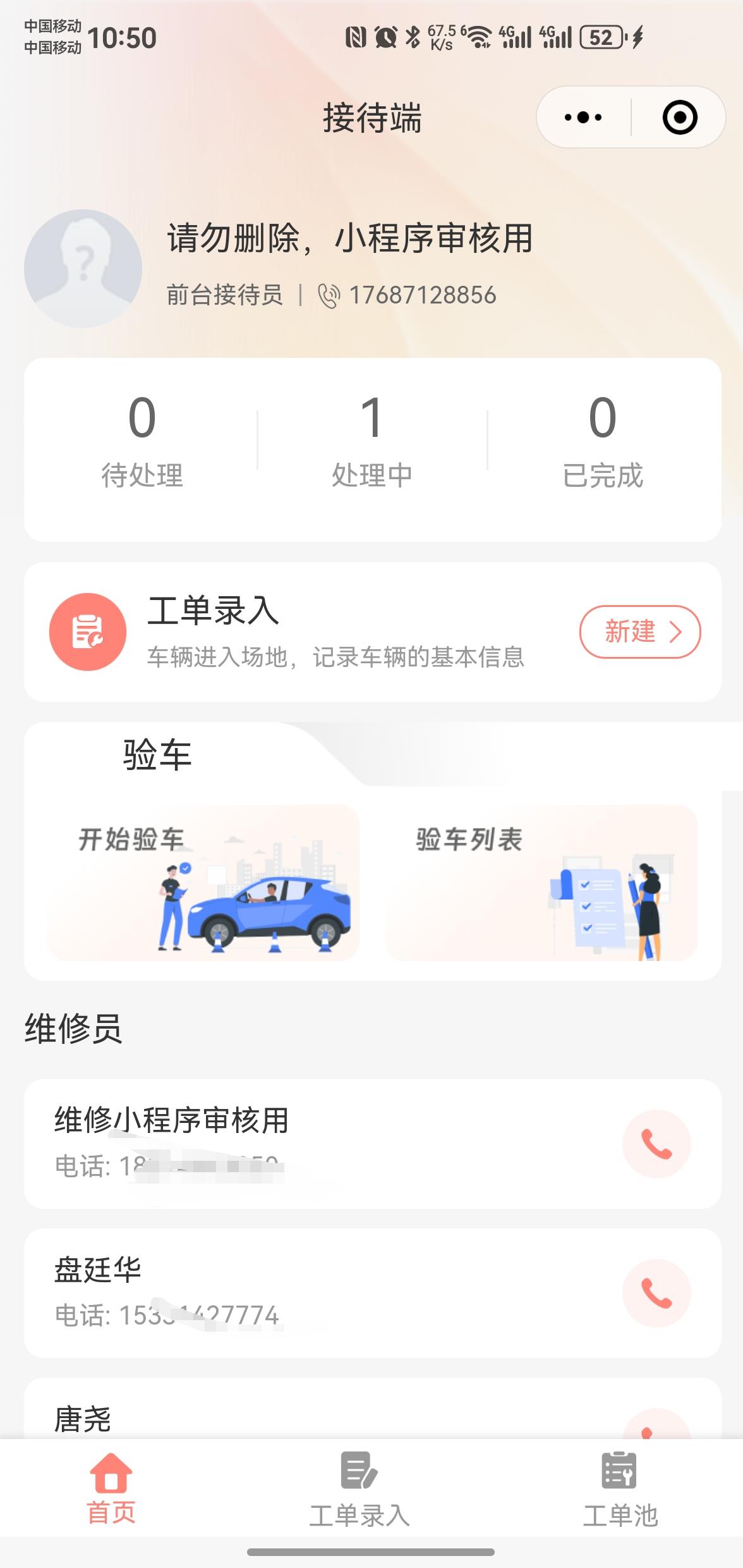 - 接待员:工单录入、分单、效率统计。
